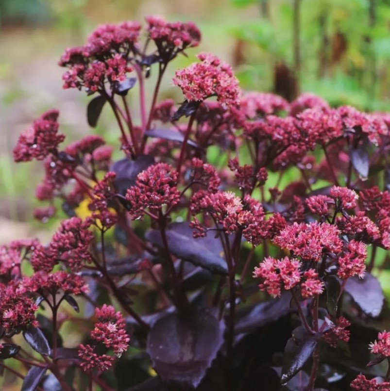- Цветы: мелкие, звездчатые, розово-красного оттенка, собраны в плотные соцветия